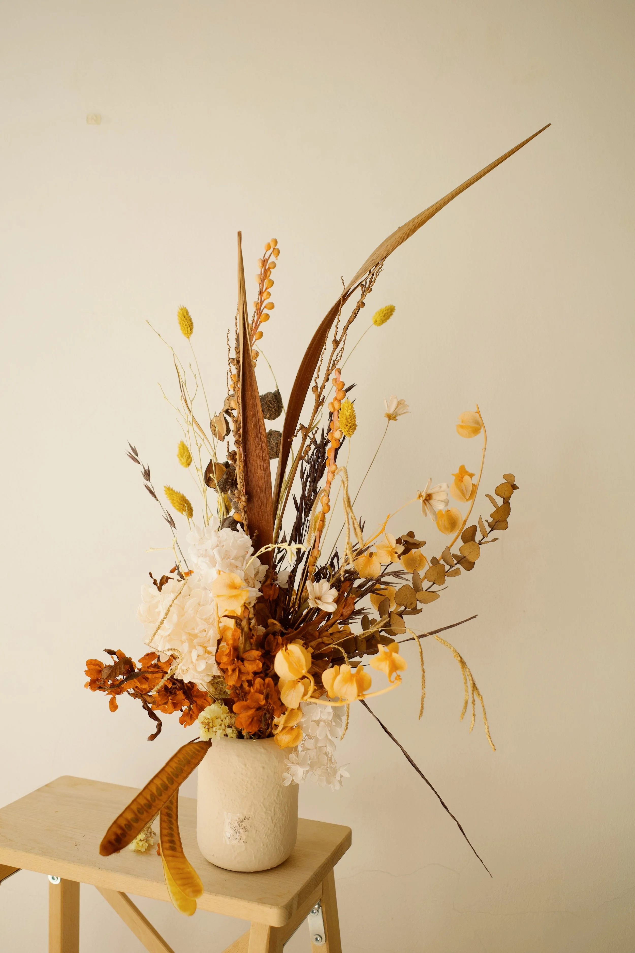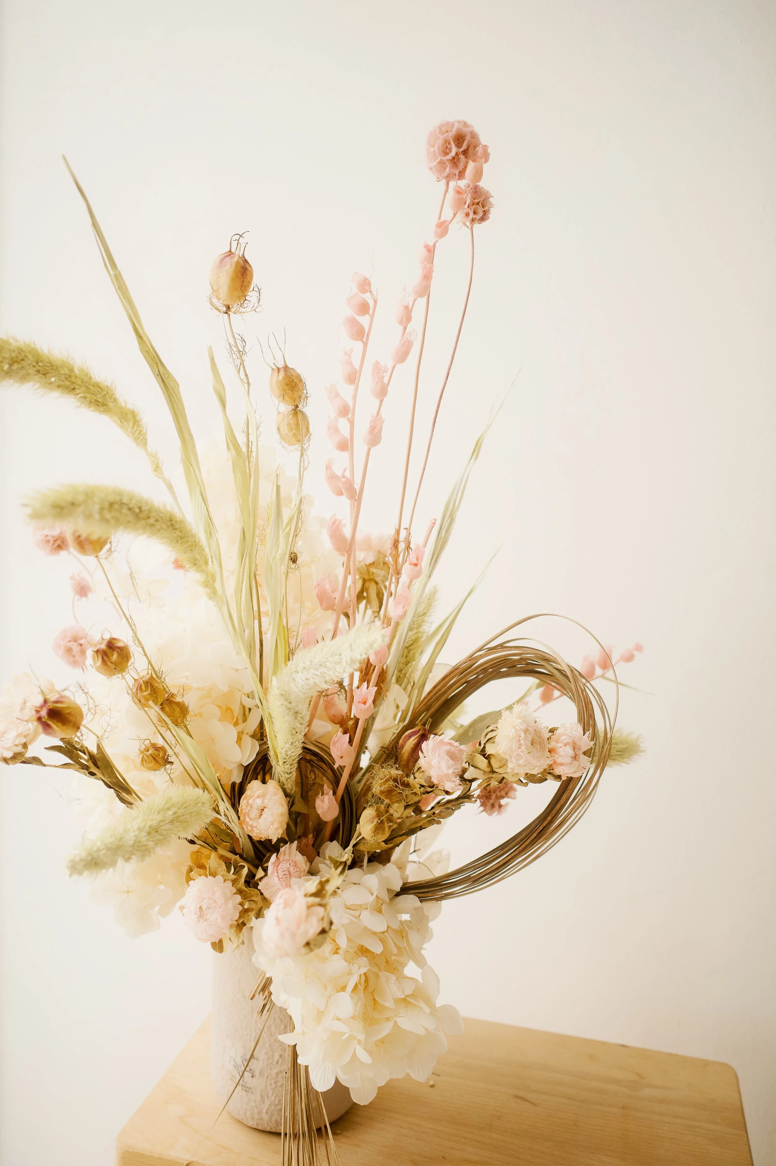 Preserved and dried florals are often tinted or dyed, and we’ll carefully choose shades that feel balanced, harmonious, and in line with your chosen mood or theme.